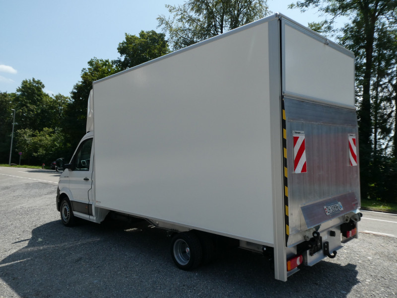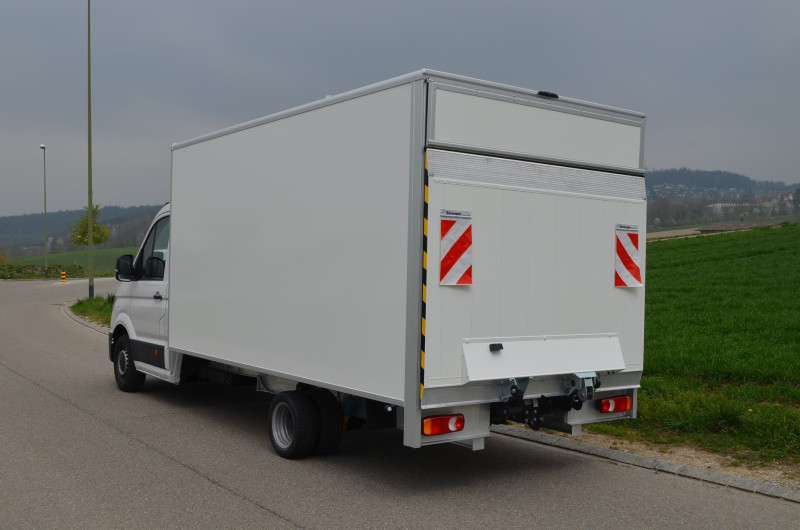 Fourgon Baldinger, charge utile maximale, parois sans rivets ni vis, surface publicitaire optimale, superstructure de caisse blanche proche RAL 9010, pourtour de fourgon en profilé aluminium anodisé argent, parois et toit de caisse en panneaux composites PRV, hayon réglable avec vérin à gaz au-dessus de la plateforme élévatrice, sol aluminium sans joints à côtes fines, adapté à une charge avec un chariot élévateur à bras de 500kg, éclairage conforme à l'OETV.