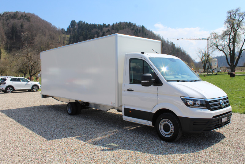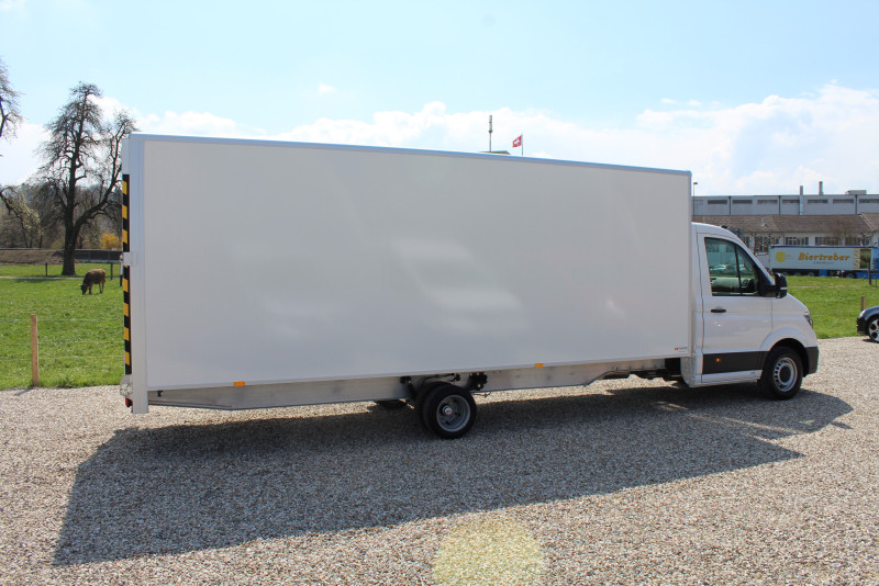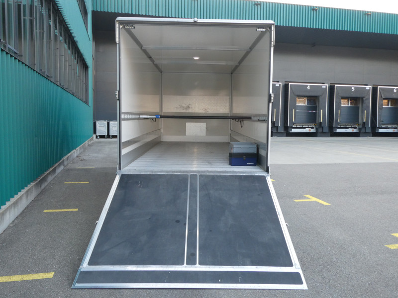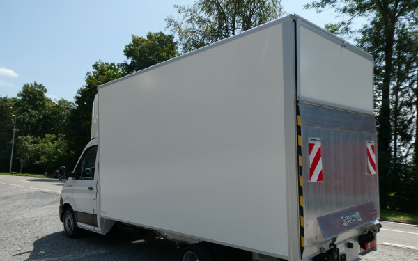 Fourgon Baldinger, charge utile maximale, parois sans rivets ni vis, surface publicitaire optimale, superstructure de caisse blanche proche RAL 9010, pourtour du fourgon en profilé aluminium anodisé argent, parois et toit de caisse en panneaux composites PRV, sol en aluminium sans joints à côtes fines, adapté à une charge avec un chariot élévateur à bras de 500 kg, arrière fermé par une rampe de chargement soutenue par un ressort de torsion, éclairage conforme à l'OETV.